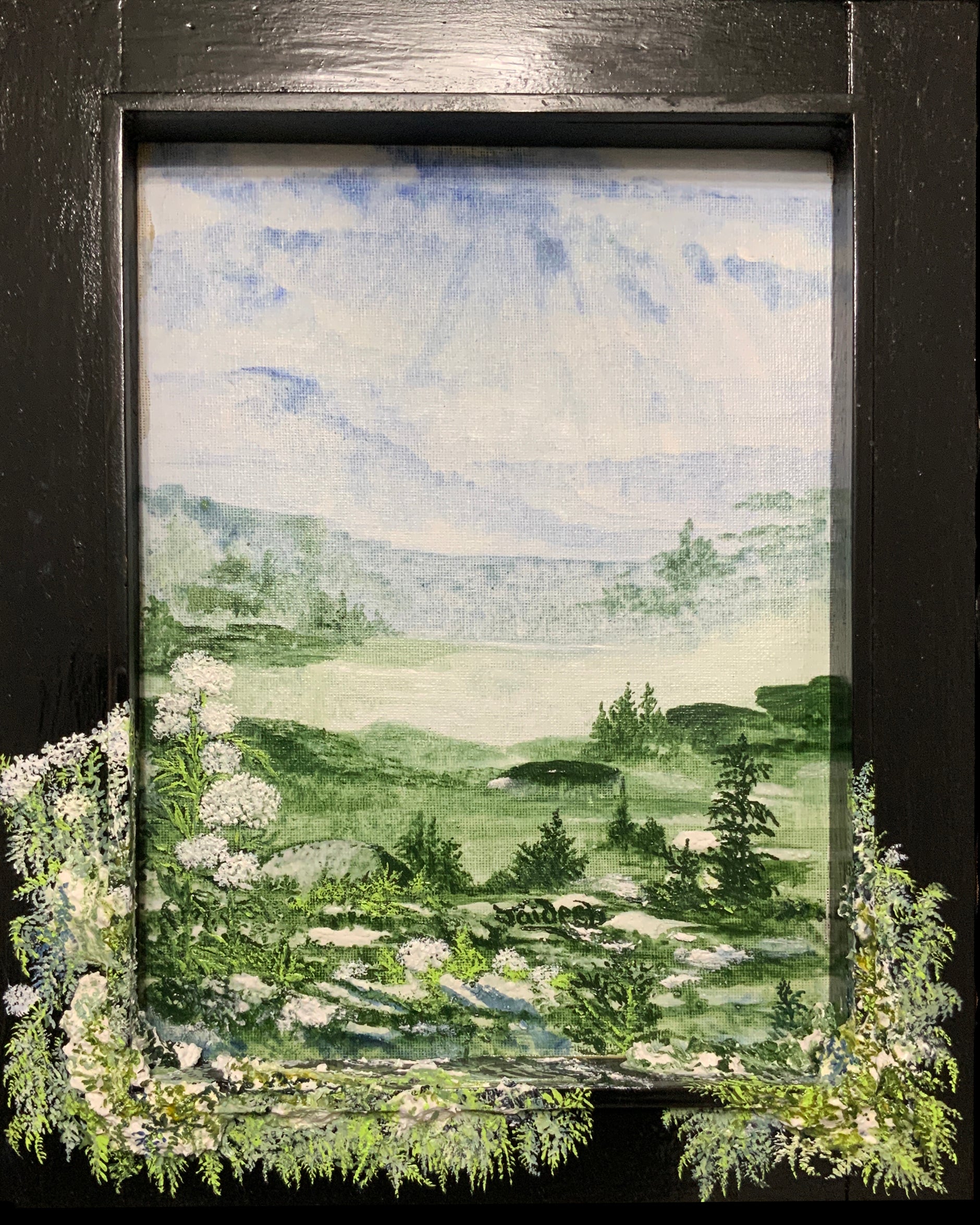 Sun-rays peeping through clouds diffused the vista far off but highlighted the contrasting lacework of mosses and ferns close by.